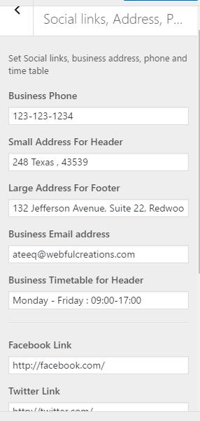 Setup social links, and address for headr top and other sections of site like footer widget.