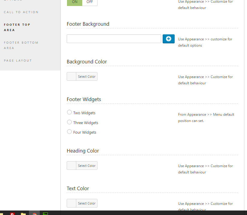 Styling footer top area, Define how many widgets to use for Global settings go to Appearance >> Customize