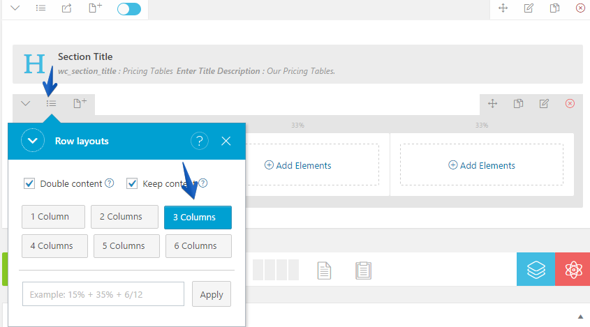 So you added a row, and inserted a title element into it. Below Title you want to add 3 columns for pricing table. Just click on inner row. and follow these screens.