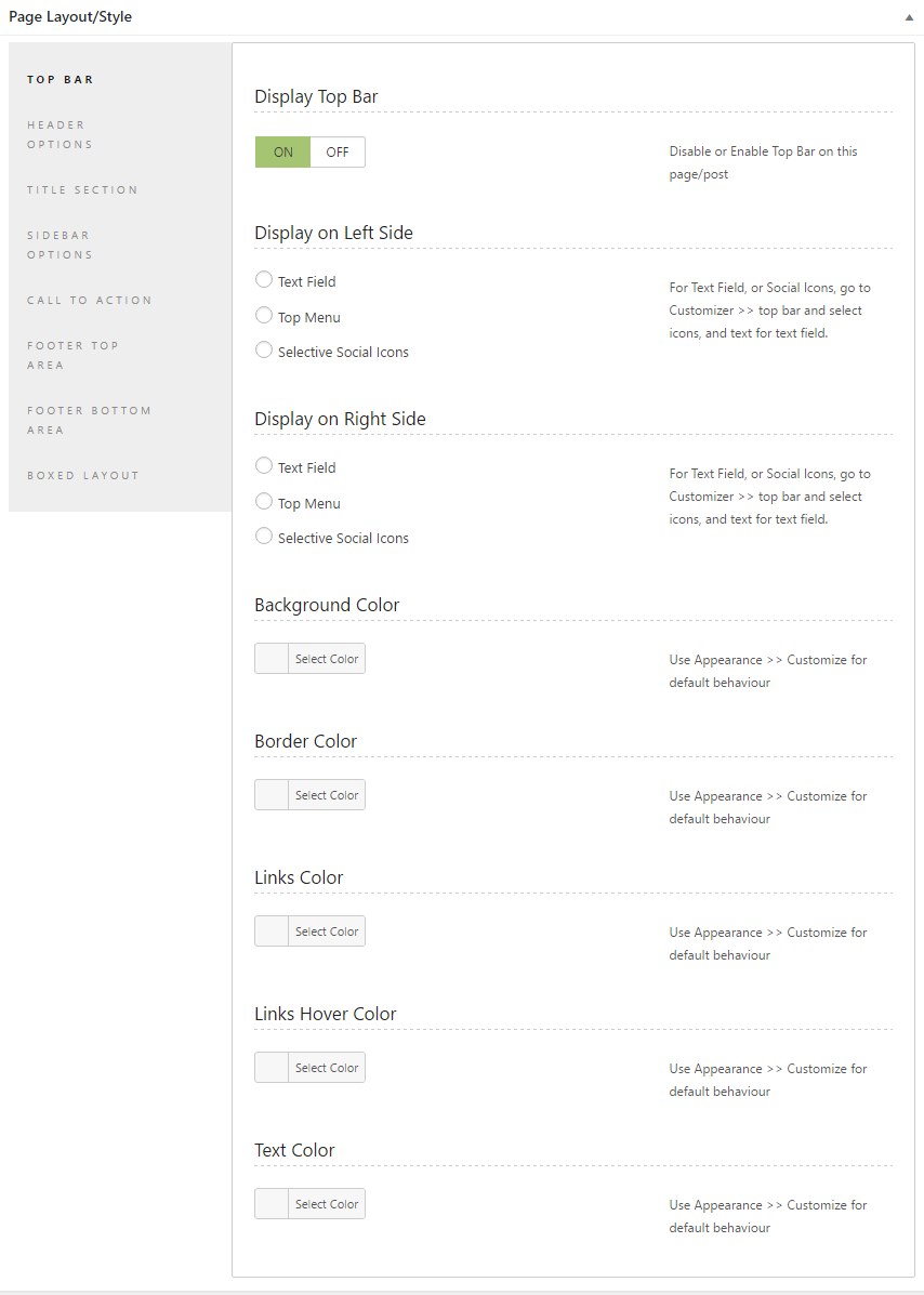 Single Post Page: Select Sidebar Position, Disable meta, Disable tags, Disable social sharing, Disable author box, Disable comments.