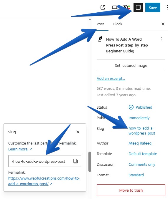 - Click on the post title or open Settings → Permalink in the editor