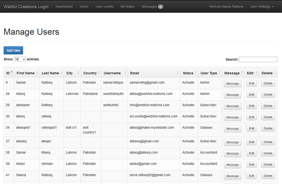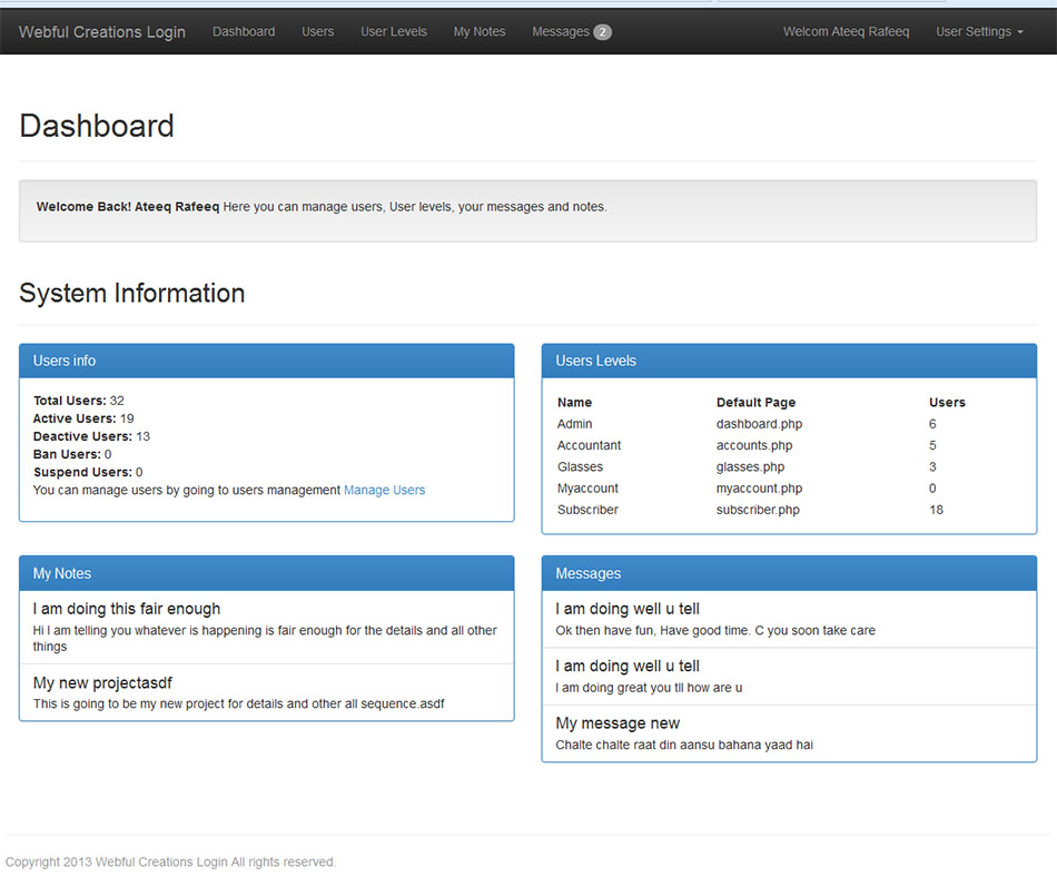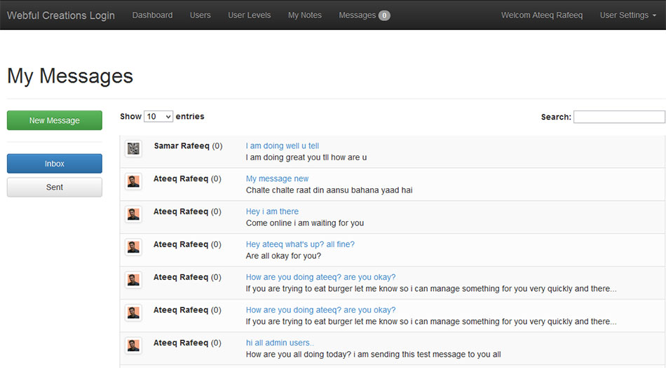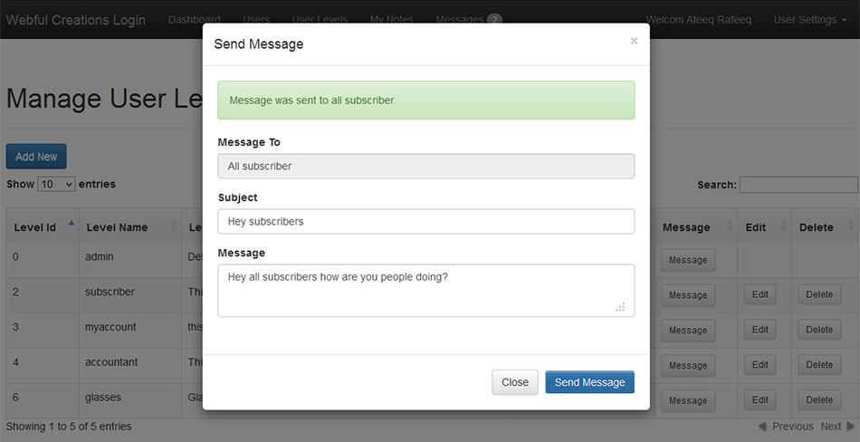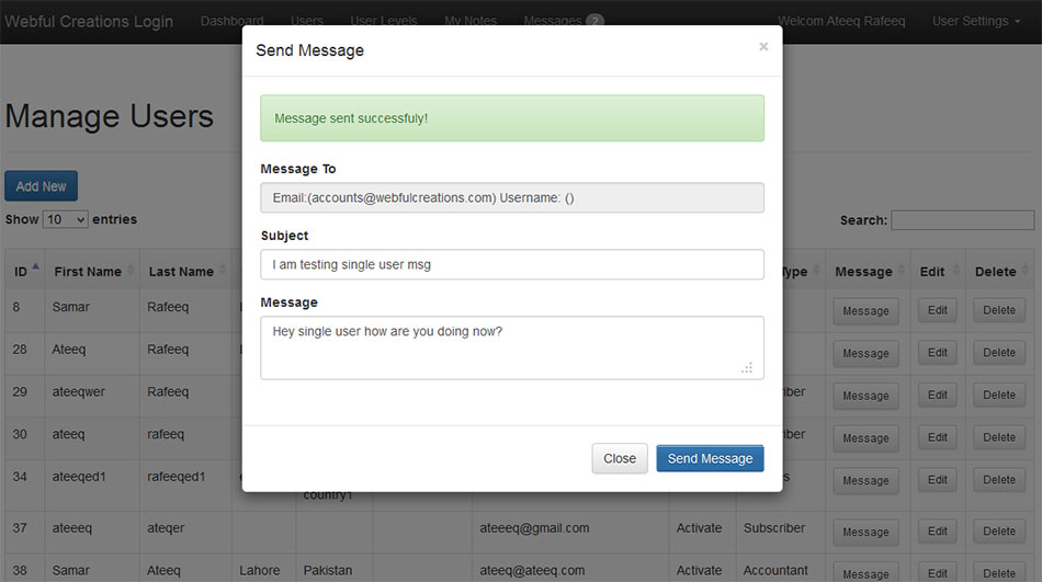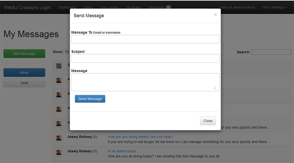 Message center is new module in php login system that have solved so many problems for users to interact with each other. Admin now can send message to any user from users page and also admin can send message to any user level that message will be sent to every user related tot hat user level. If you know the username or email address of a user who is already in system you can send him/her a message. Also includes sent items, inbox more features are coming soon.
