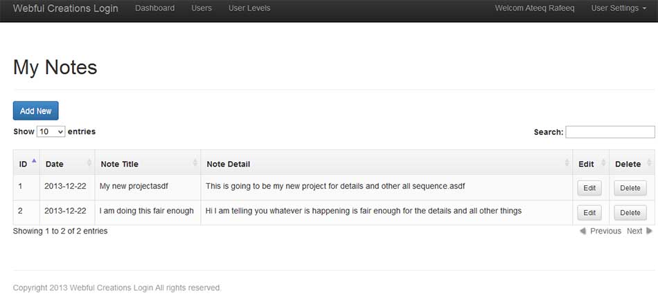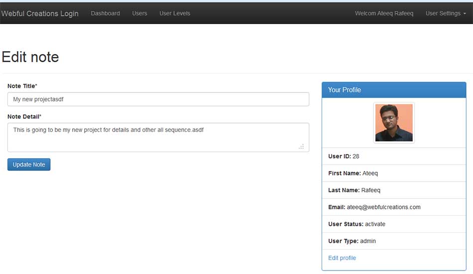 PHP login system have new great module with name my notes, That give ability to every user so they can save their personal notes for future use, in php login system users can save their notes then they can edit, delete, update as well. I just made this module cause sometime i have to save some information in every login interface for the related web this is the reason this section give ability to users from php login to save their notes.